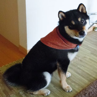 手作りお洋服を着たお客様のかわいい愛犬です。