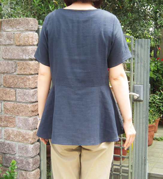 ☆ペプラムのきれいなフレアを出すため、ソフトな素材の使用をおすすめします。紺色のサンプルはダブルガーゼ、ピンクのサンプルはリネンを使用。