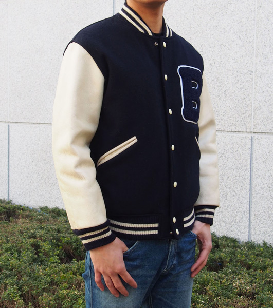 ☆ゆったり目のボディに袖が太めで肩が落ちるクラシックなスタジャンのシルエットを取り入れました。衿、袖口、裾にリブニットが付く本格的なジャンパーです。