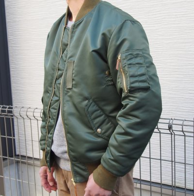 ☆MA-1のデザインの特徴でもある袖のポケットやフロントの無線機コード通し、クリップ留めのパーツが付きます。